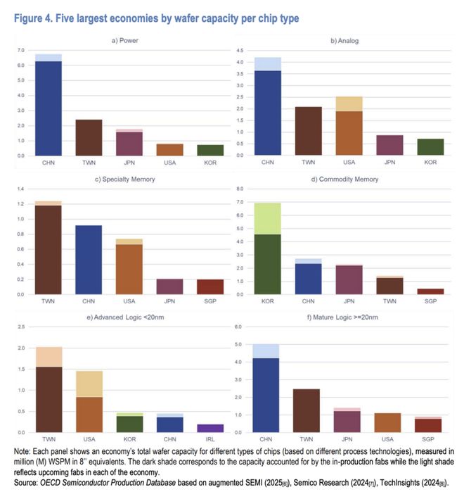 对于每种芯片类型,图 4 显示了总晶圆产能最高的五个经济体,排名依据是晶圆厂的地理位置,而非公司总部所在地。深色表示在产产能,浅色表示即将投产(在建和规划中)的产能。