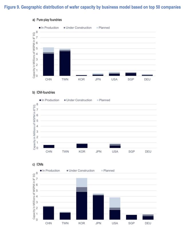 半导体制造的商业模式也在不断演变。虽然晶圆厂通常由纯晶圆代工厂或集成器件制造商 (IDM) 运营,但一些 IDM(例如英特尔、三星)调整了其商业模式,在其部分或全部晶圆厂中也提供晶圆代工服务(称为“IDM-代工厂”)。因此,在分析晶圆产能的地域分布时,商业模式是另一个重要的考虑因素。本节的分析区分了以下三种产能:i) IDM 产能,ii) 纯晶圆代工厂产能,以及 iii) IDM-代工厂产能。