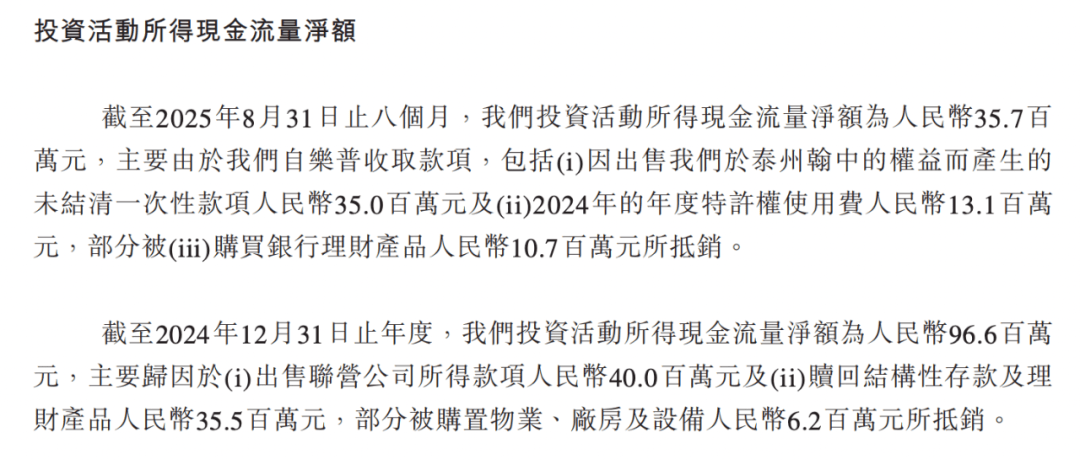 招股书显示,2022年至2024年,公司收到的特许权使用费分别为约70万元、440万元及1310万元。由于该部分收入与公司目前主业无关,因此计入了投资活动所得现金流。