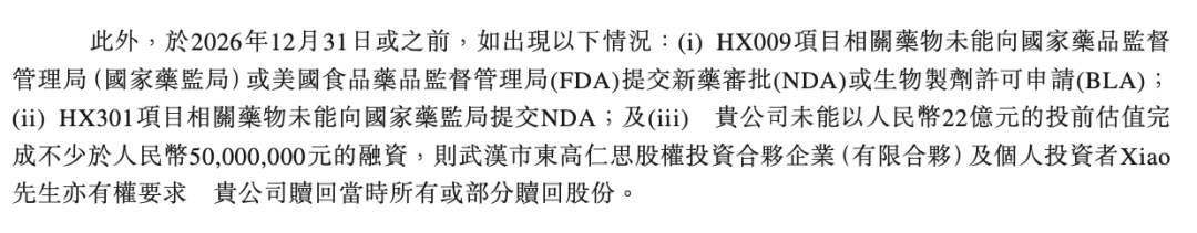 招股书显示,若核心管线HX009未能于2026年12月31日或之前向中国国家药监局或美国FDA提交新药审批(NDA)或生物制品许可申请(BLA),或者HX301项目未能向国家药监局提交NDA,相关投资者有权要求公司赎回其持有的全部或部分股份。