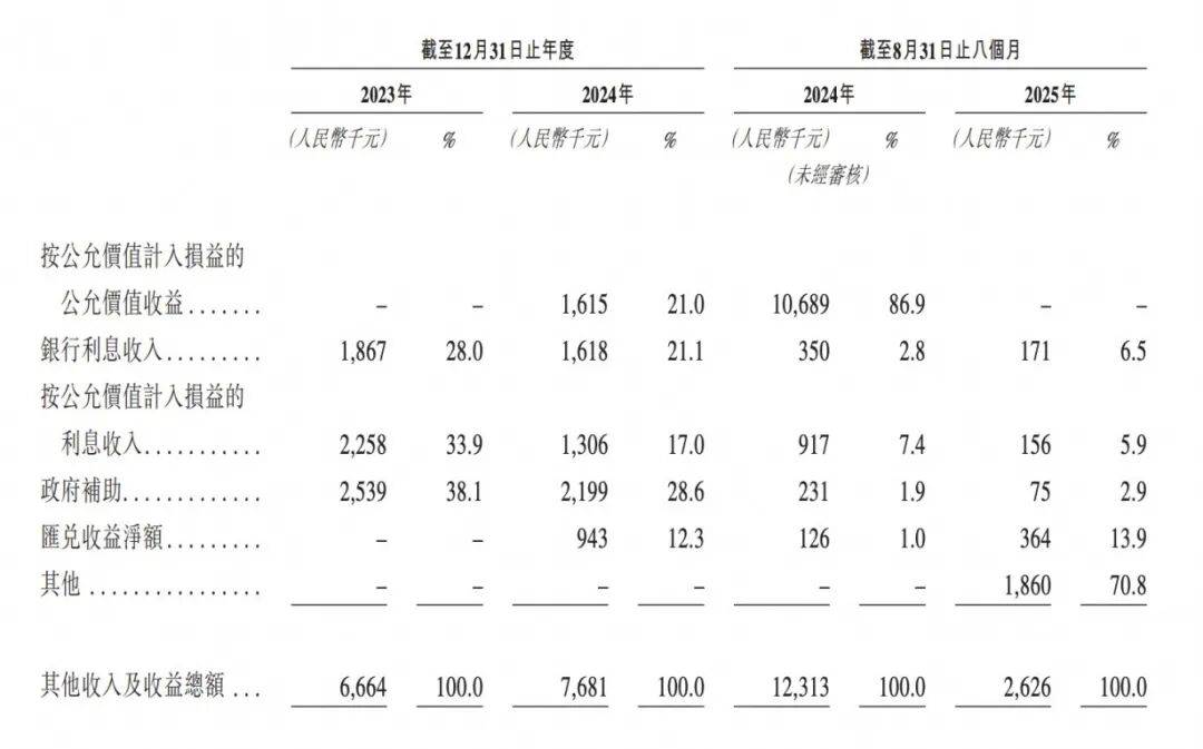 而翰思艾泰自身无主营收入,在2023年和2024年的“其他收入和收益”,仅分别为666万元与768万元,大多来自于政府补助于利息收入。值得注意的是,2024年前8个月的收入还高出2024年全年收入不少。