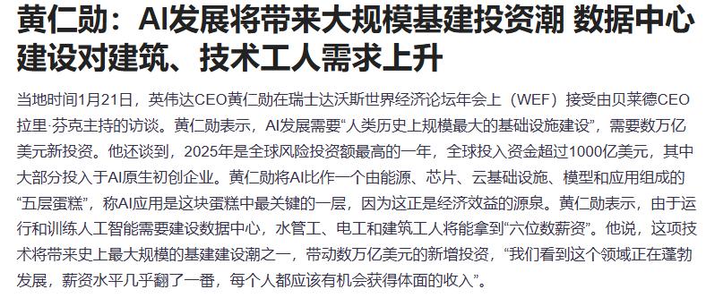 英伟达CEO黄仁勋在瑞士达沃斯世界经济论坛年会上(WEF)接受由贝莱德CEO拉里·芬克主持的访谈。黄仁勋表示,AI发展需要“人类历史上规模最大的基础设施建设”,需要数万亿美元新投资。他还表示,这项技术将带来史上最大规模的基建建设潮之一,带动数万亿美元的新增投资,“我们看到这个领域正在蓬勃发展,薪资水平几乎翻了一番,每个人都应该有机会获得体面的收入”。