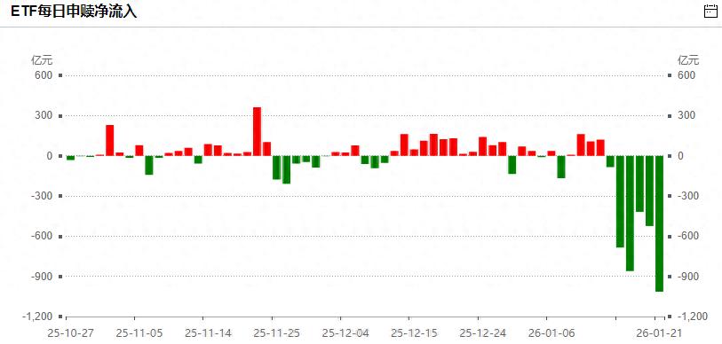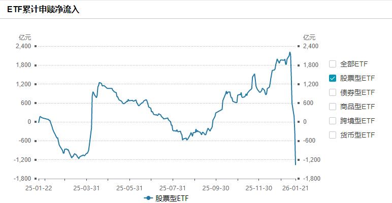 虽然知道昨天gjd卖出ETF的量比较大,但早上起来一看还是吓到了,单日净卖出超过1000亿,五个交易日总计卖出超过3500亿,这导致近一年股票型ETF从净流入超过2200亿到净卖出超过1300亿。
