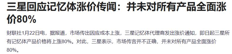 据报道,市场传出因应成本上涨,三星记忆体代理商发出涨价通知,即日起三星所有记忆体产品价格将上涨80%。对此,三星表示,市场传言并不正确,并未对所有产品全面涨价80%。