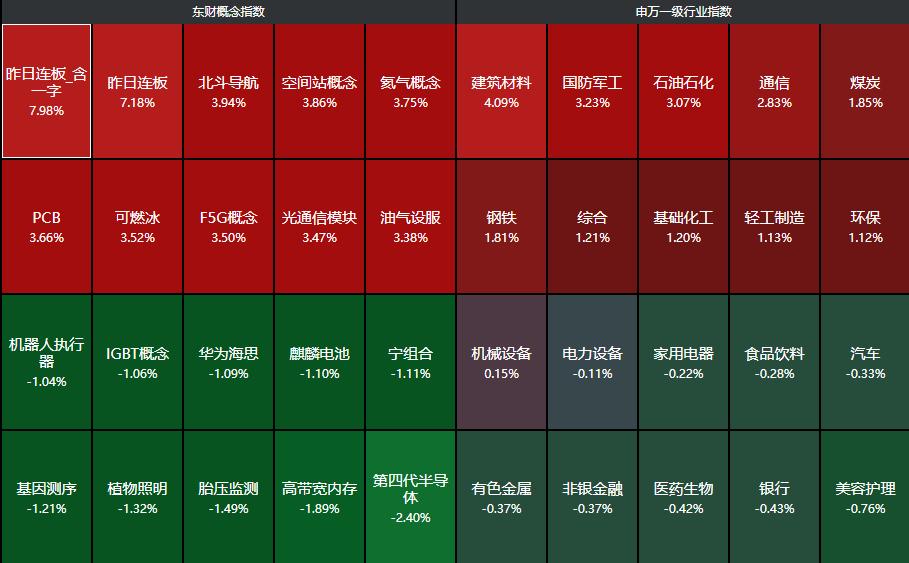 分行业来看,建筑材料、国防军工、石油石化、通信、煤炭等行业领涨,美容护理、银行、医药生物、非银金融、有色金属等行业领跌。