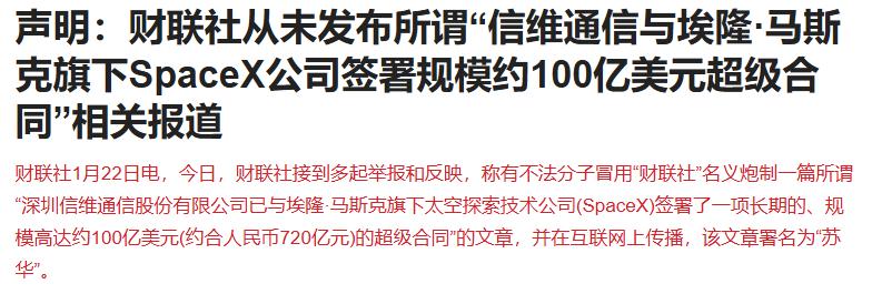 今天有不法分子冒用“财联社”名义炮制一篇所谓“深圳信维通信股份有限公司已与埃隆·马斯克旗下太空探索技术公司(SpaceX)签署了一项长期的、规模高达约100亿美元(约合人民币720亿元)的超级合同”的文章,并在互联网上传播,该文章署名为“苏华”。财联社对此辟谣,但$信维通信(SZ300136)$信维通信收盘仍涨超10%。