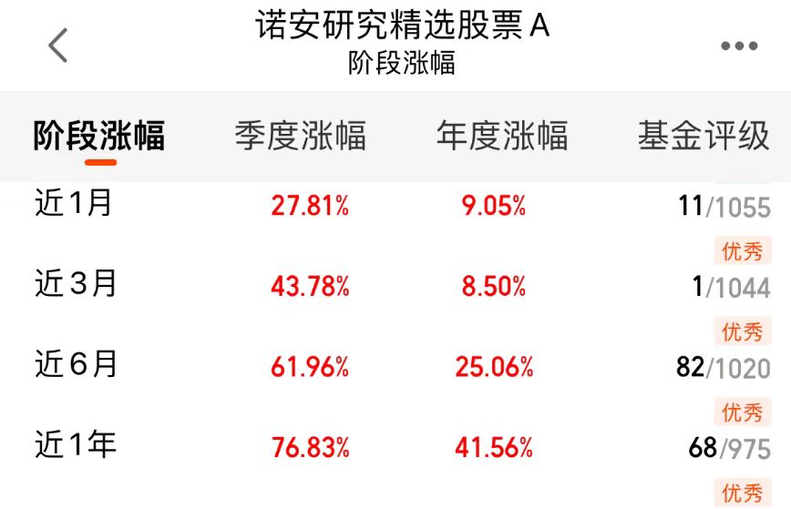 从基金的数据来看,诺安研究精选A近三月的净值增长率在同类中排名首位,投资收益率超过43%。