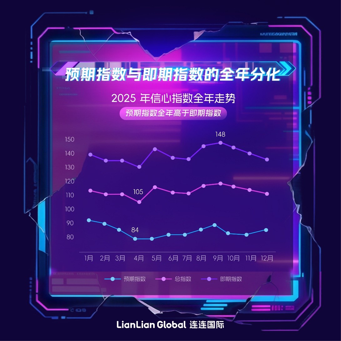 近日,连连国际发布的LianLian跨境商家信心指数2025年度回顾报告显示:2025年跨境卖家一边承受成本与竞争压力,一边依然对未来经营保持投入与信心。
