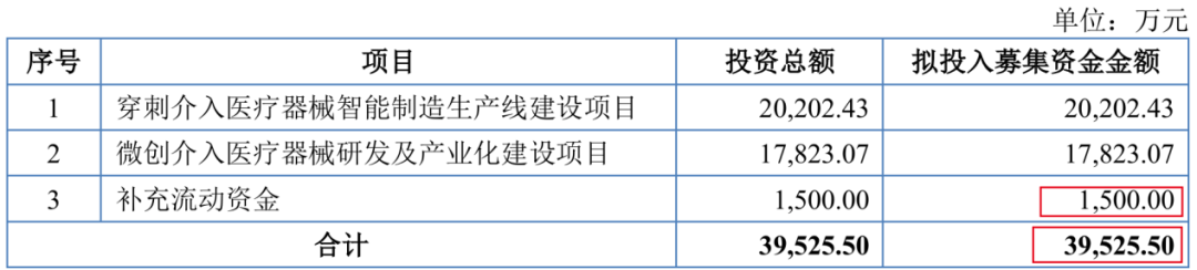 此次IPO,公司拟募集资金3.95亿元,用于穿刺介入医疗器械智能制造生产线建设、微创介入医疗器械研发及产业化建设,还有1500万元计划用于补充流动资金。