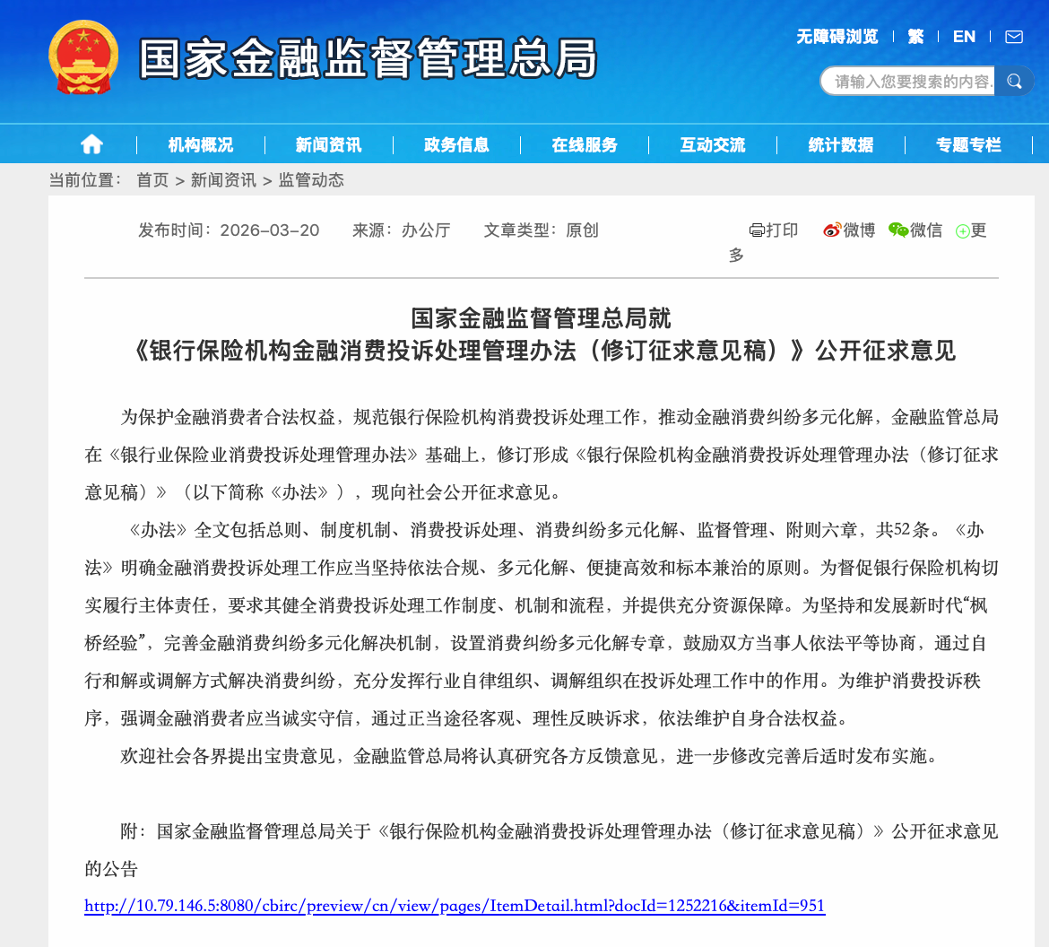 3月20日,国家金融监督管理总局公布了《银行保险机构金融消费投诉处理管理办法(修订征求意见稿)》。该办法旨在进一步保护金融消费者合法权益,规范银行保险机构投诉处理工作,推动金融消费纠纷多元化解。修订稿对投诉处理时限、机构主体责任、消费者行为规范等方面提出了更为具体和严格的要求。