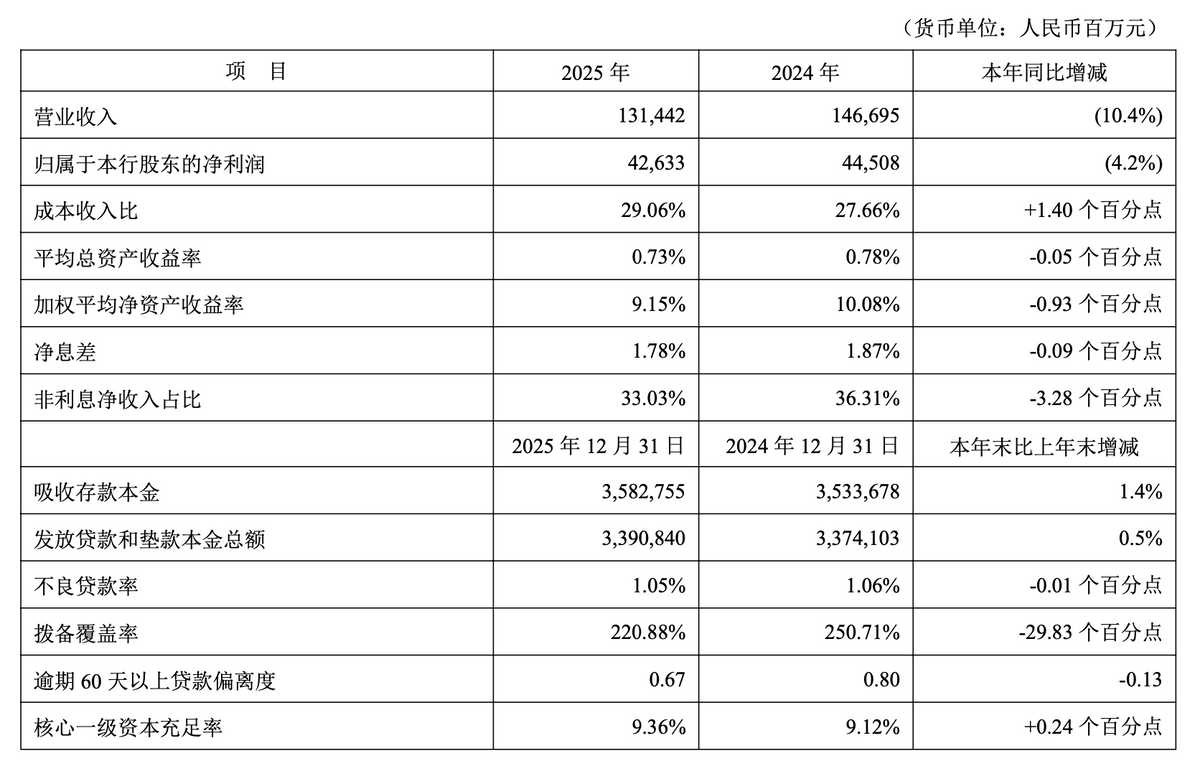 从资产质量来看,截至2025年末,平安银行的不良贷款率为1.05%,较上年末下降0.01个百分点;不拨备覆盖率为220.88%,持续保持在良好水平。同期,核心一级资本充足率、一级资本充足率及资本充足率分别为 9.36%、11.49%、13.77%, 较上年末分别上升 0.24、0.80、0.66 个百分点。
